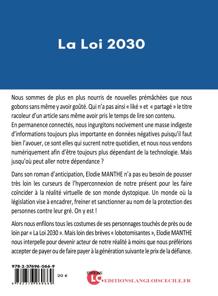 Dans son roman d’anticipation, Elodie MANTHE n’a pas eu besoin de pousser très loin les curseurs de l’hyperconnexion de notre présent pour les faire coïncider à la réalité virtuelle de son monde dystopique. Un monde où la législation vise à encadrer, freiner et sanctionner au nom de la protection des personnes contre leur gré. On y est !