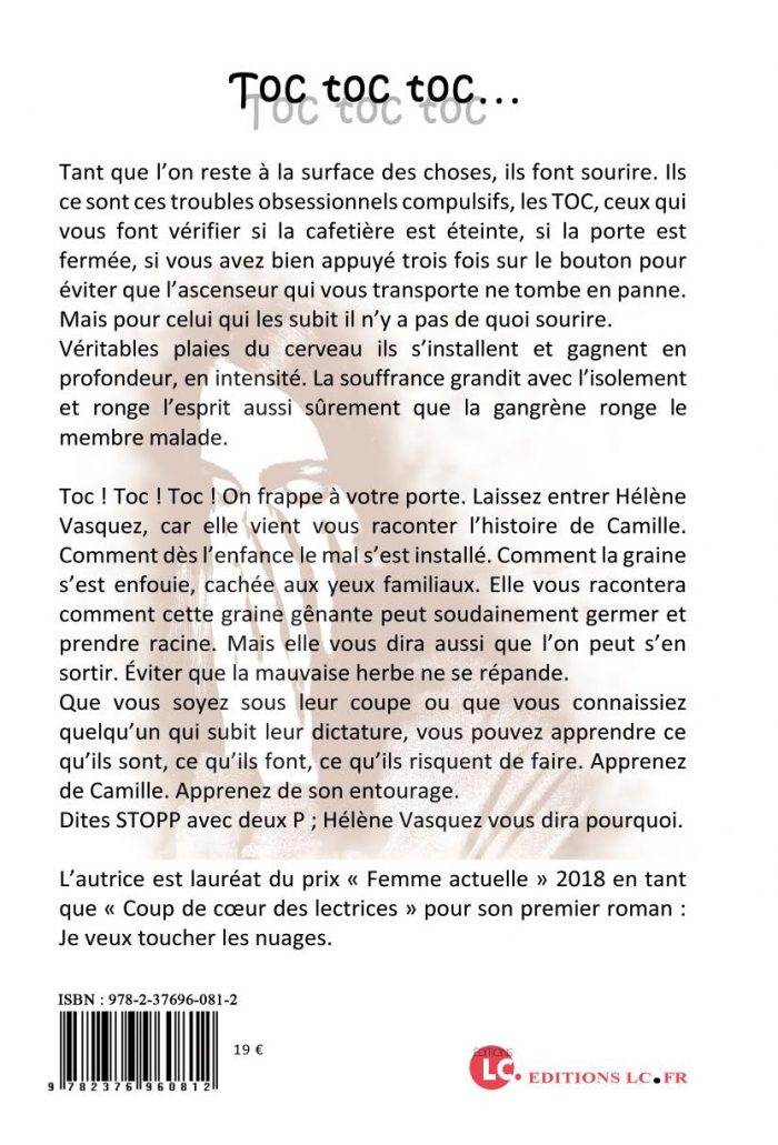 Voilà un roman de Hélène Vasquez qui m’éclaire sur une maladie plus que destructrice : les TOC. Dans la première partie, nous découvrons Camille à travers un drame qui va changer le cours de sa vie. Dans la deuxième partie, la maladie et ses conséquences sont abordées de manière très imagée et nous suivons Camille dans cet enfer. Très impressionnant mais avec l’espoir de s’en sortir car c’est possible !