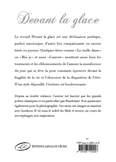 Le recueil Devant la glace est une déclinaison poétique, parfois narcissique, d’autre fois compatissante ou encore triste ou joyeuse. Quelques titres comme «La vieille dame » ou « Moi je…