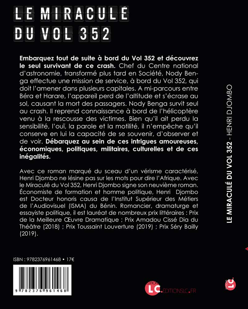 Avec ce roman marqué du sceau d’un vérisme caractérisé, Henri Djombo ne lésine pas sur les mots pour dire l’Afrique. Avec le Miraculé du Vol 352, Henri Djombo signe son neuvième roman. Économiste de formation et homme politique, Henri Djombo est Docteur honoris causa de l’Institut Supérieur des Métiers de l’Audiovisuel (ISMA) du Bénin. Romancier, dramaturge et essayiste politique, il est lauréat de nombreux prix littéraires : Prix