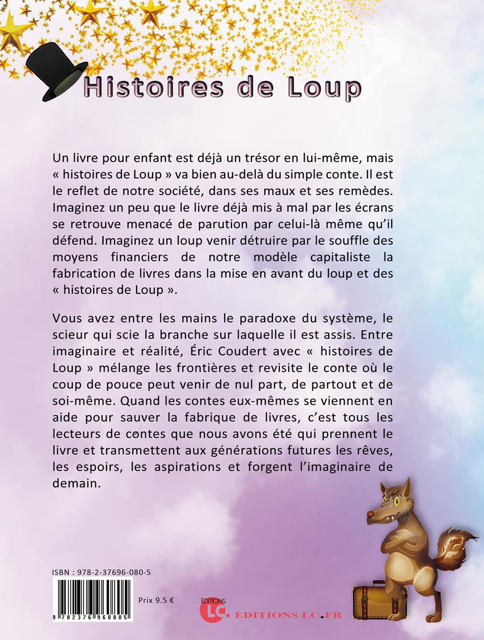 Vous avez entre les mains le paradoxe du système, le scieur qui scie la branche sur laquelle il est assis. Entre imaginaire et réalité, Éric Coudert avec « histoires de Loup » mélange les frontières et revisite le conte où le coup de pouce peut venir de nul part, de partout et de soi-même. Quand les contes eux-mêmes se viennent en aide pour sauver la fabrique de livres, c’est tous les lecteurs de contes que nous avons été qui prennent le livre et transmettent aux générations futures les rêves, les espoirs, les aspirations et forgent l’imaginaire de demain.