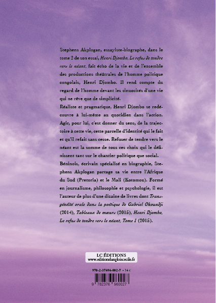 Stephens Akplogan, essayiste-biographe, dans le tome 2 de son essai, Henri Djombo, Le refus de tendre vers le néant, fait écho de la vie et de l’ensemble des productions théâtrales de l’homme politique congolais, Henri Djombo. Il rend compte du regard de l’homme devant les sinuosités d’une vie qui ne rêve que de simplicité.