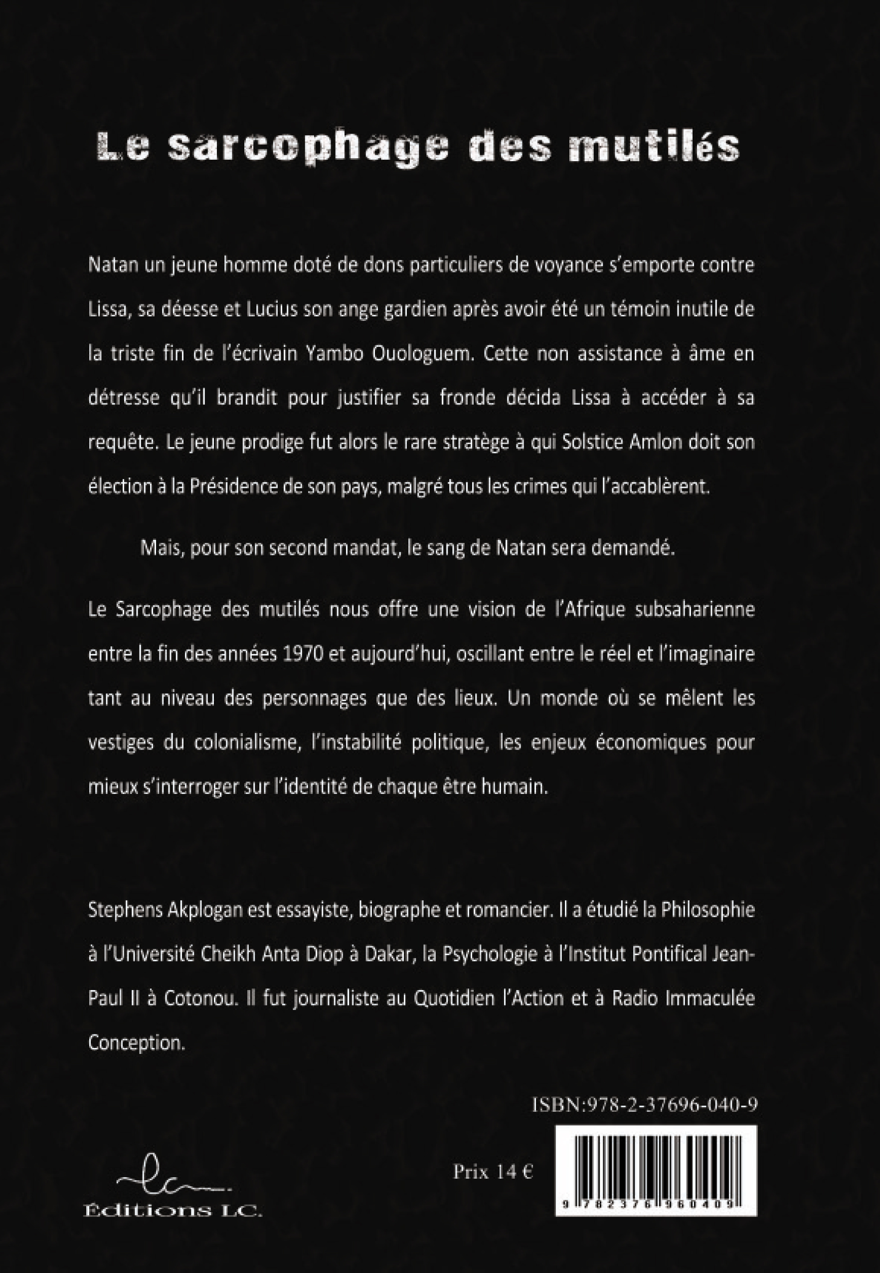 Natan un jeune homme doté de dons particuliers de voyance s’emporte contre Lissa, sa déesse et Lucius son ange gardien après avoir été un témoin inutile de la triste fin de l’écrivain YamboOuologuem. Cette non assistance à âme en détresse qu’il brandit pour justifier sa fronde décida Lissa à accéder à sa requête. Le jeune prodige fut alors le rare stratège à qui Solstice Amlon doit son élection à la Présidence de son pays, malgré tous les crimes qui l’accablèrent. Mais, pour son second mandat, le sang de Natan sera demandé. Le Sarcophage des mutilés nous offre une vision de l’Afrique subsaharienne entre la fin des années 1970 et aujourd’hui, oscillant entre le réel et l’imaginaire tant au niveau des personnages que des lieux. Un monde où se mêlent les vestiges du colonialisme, l’instabilité politique, les enjeux économiques pour mieux s’interroger sur l’identité de chaque être humain. Stephens Akploganest essayiste, biographe et romancier. Il a étudié la Philosophie à l’Université Cheikh AntaDiop à Dakar, la Psychologie à l’Institut Pontifical Jean-Paul II à Cotonou. Il fut journaliste au Quotidien l’Action et à Radio Immaculée Conception.