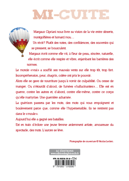 Un récit ? Plutôt des notes, des confidences, des souvenirs qui se pressent, se bousculent. Margaux écrit comme elle vit, à f leur de peau, sincère, naturelle, elle écrit comme elle respire et vibre, enjambant les barrières des normes. Le monde « vrai » a soufflé ses mauvais vents sur elle trop tôt, trop fort. Incompréhension, peur, chagrin, colère ont pris le pouvoir. Alors elle se gave de nourriture jusqu’à vomir de culpabilité. Ou cesse de manger. Ou s’étourdit d’alcool, de fumées « hallucinantes »… Elle est en guerre, contre les autres et, d’abord, contre elle-même, contre ce corps qu’elle martyrise. Une guerrière acharnée. La guérison passera par les mots, des mots qui vous empoignent et bouleversent parce que, comme elle l’hypersensible, ils ne rentrent pas dans le « moule ». Aujourd’hui elle a gagné ses batailles. Est en train d’éclore une jeune femme ardemment artiste, amoureuse du spectacle, des mots. L’aurore se lève. Photographie de couverture © Nicolas Leclerc.