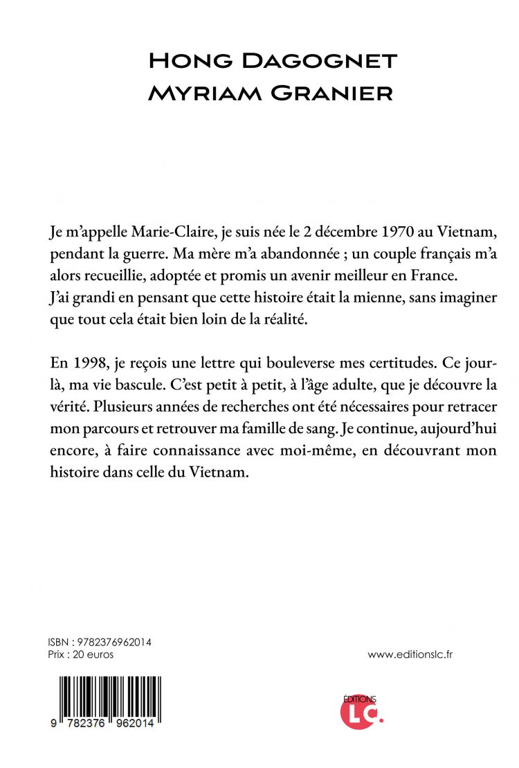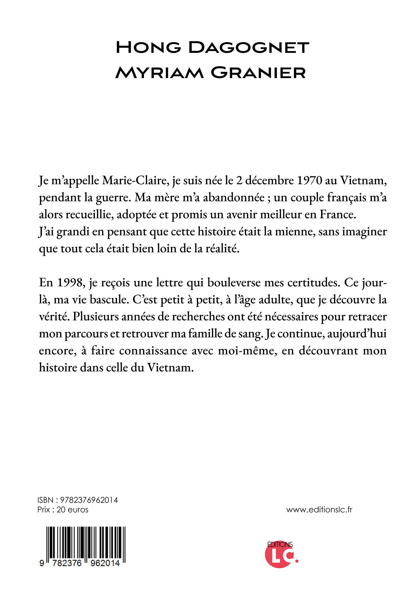 Je m’appelle Marie-Claire, je suis née le 2 décembre 1970 au Vietnam, pendant la guerre. Ma mère m’a abandonnée ; un couple français m’a alors recueillie, adoptée et promis un avenir meilleur en France.